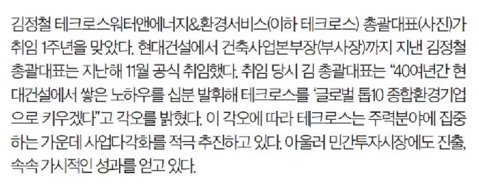 김 총괄대표는 “건설업과 환경업은 인류와 환경의 지속성을 담보한다는 점이 공통점”이라며 “건설업에서 얻은 경험과 지식을 충분히 살려 테크로스를 매출 1조원대의 종합환경기업으로 이끌 것”이라고 다짐했다. 이어 “이 과정에서 디지털 전환을 가속화해 환경 운영관리의 효율성과 안정성도 강화할 것”이라고 밝혔다.